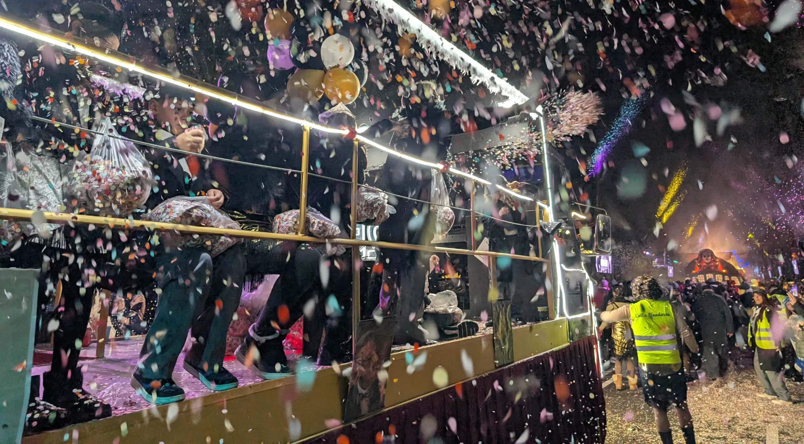 Muy pronto teníamos diez centímetros de espesor de confeti. La batalla era total: “todos disparábamos contra todos. Las collas contra el público, el público contra las carrozas y sus collas. Hombres contra mujeres, niños contra adultos, merengues contra culés, hispanoamericanos contra ucranianos… Y viceversa. Y así durante dos horas, todos bailando al ritmo de la música en un espectáculo de luces y colores.