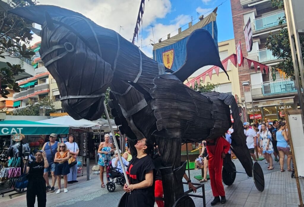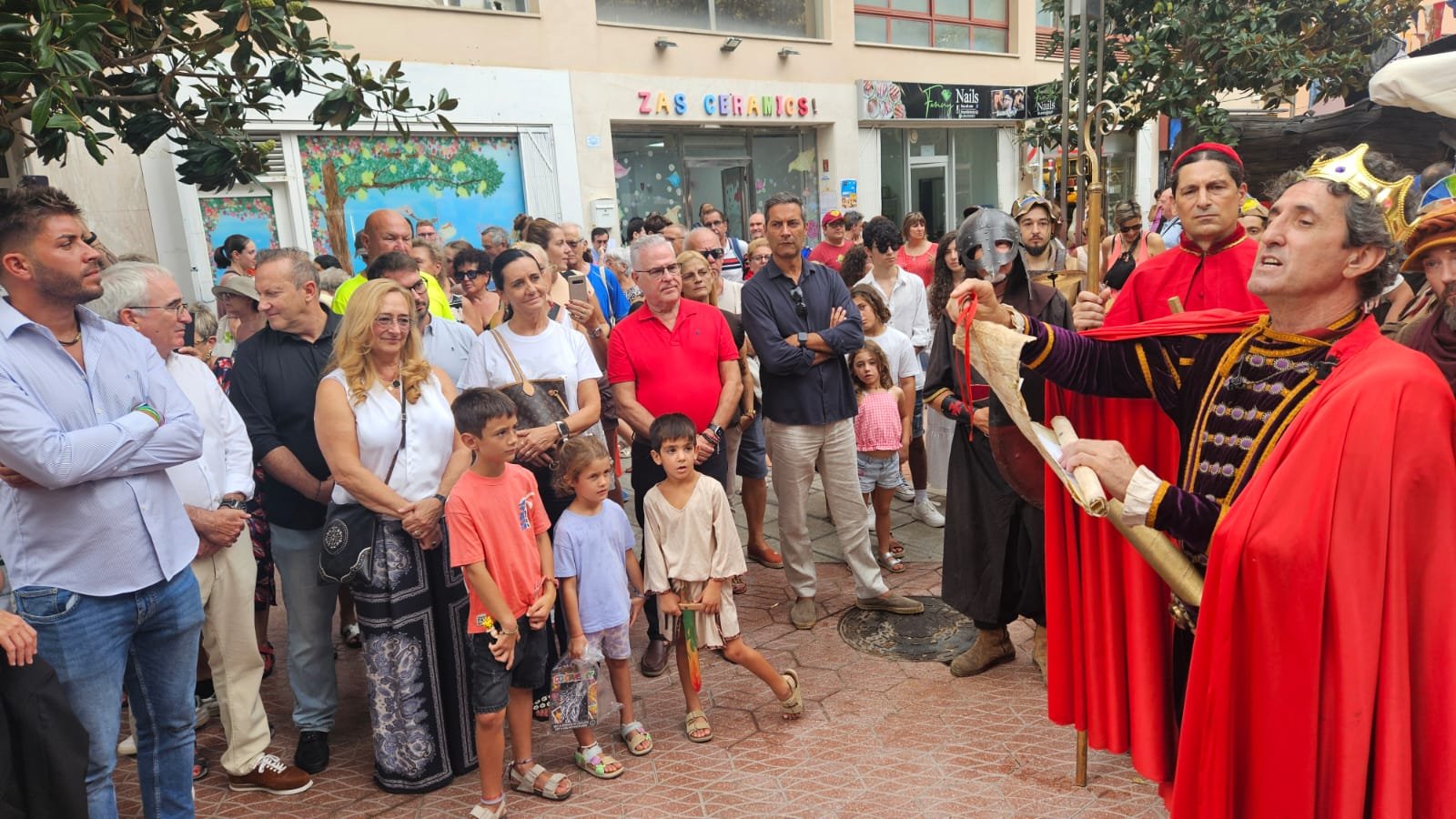 El pregón del rey Jaume I y su corte han inaugurado este jueves el mercado medieval de Salou, ubicado en las calles del casco antiguo y en la plaza Bonet hasta el domingo, 7 de septiembre. Un grupo de recreación ha recordado cómo se vivió la partida del monarca desde Salou hacia Mallorca y, a continuación, la corte ha desfilado acompañada de una banda musical, un caballo de madera y un elefante de guerra.