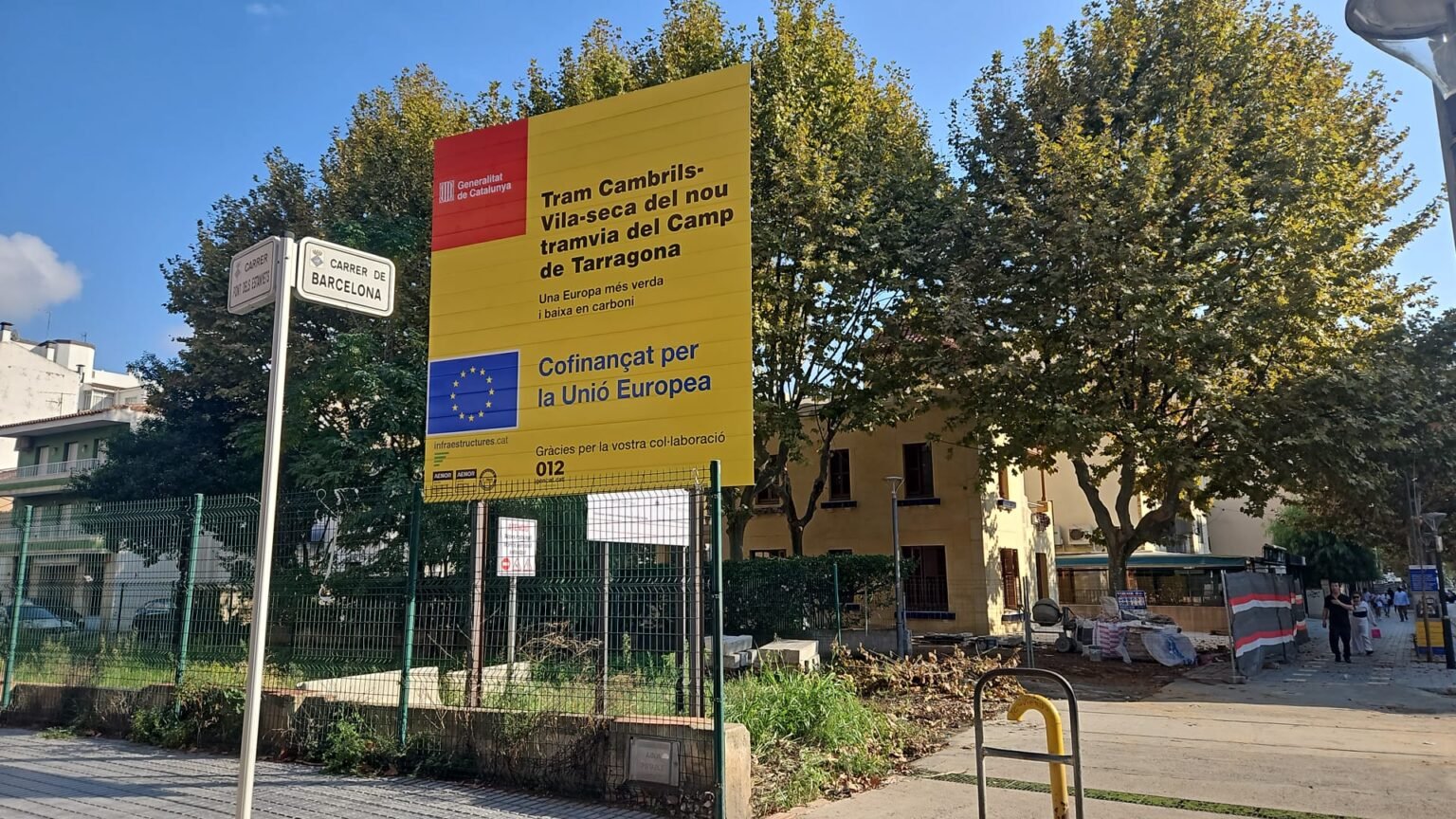 Un cartel en el otrora paso a nivel de la calle Barcelona de Salou ya anuncia los trabajos del tramo entre Cambrils y Vila-seca del tranvía, y en la calle Camí del Corralet, en Vilafortuny, ya hay operarios.