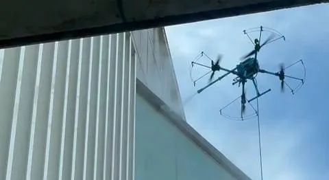 El dron, equipado con un sistema de limpieza a presión, es controlado por el personal de limpieza y permite actuar en altura sin necesidad de utilizar plataformas elevadoras ni otras herramientas auxiliares.